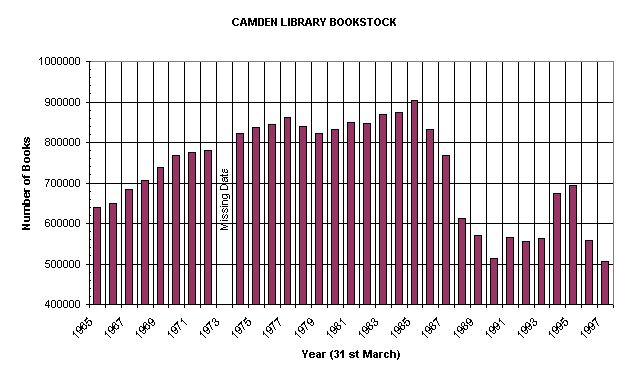 At the creation of Camden, in 1965, the borough inherited a strong, well-supported library service, with 17 libraries (each open for 60 hours per week) and, for a number of years thereafter, it remained so. However, in the early 1970s a change of attitude occurred within Camden Council and the previous commitment to the provision of excellent library services became far more muted. The number of libraries was reduced to 14, but for a decade Camden�s library service managed to survive reasonably well by means of good management. This period of stability came to an end in the mid 1980s when Camden decided that library services in the borough should be sacrificed to bolster other, more favoured, activities. This set the pattern for the council�s attitude for the next two decades. The effect of this history of waning commitment can be seen in the following charts. In order to avoid distorting factors caused by strikes, library refurbishment closures and the general turbulence of the most recent years, these charts cover the years up to 1997 only. Although the loan bookstock data is almost complete, that for other parameters is less so for the early years of Camden�s existence. The data analysis is therefore restricted to the years 1975 � 1997. Twenty-three years of data is sufficient to establish, with confidence, any trend within the data.