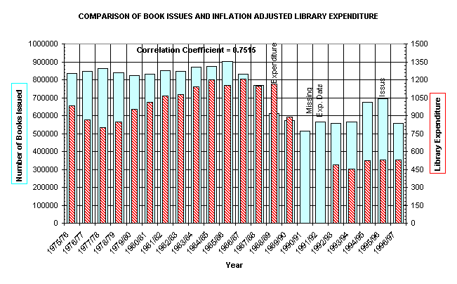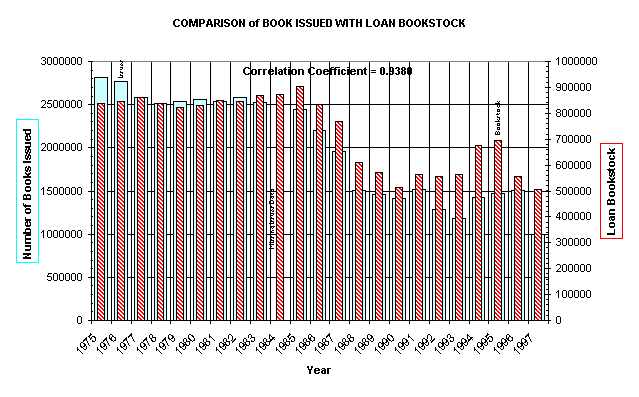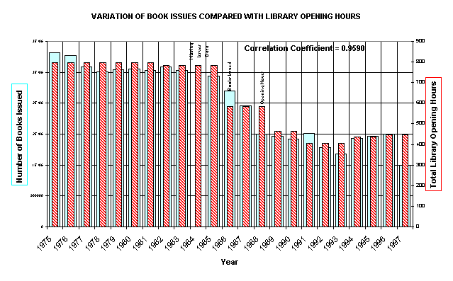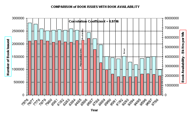 A visual inspection of the above chart, showing the variation of the number of book issues and opening hours with time, leads to the conclusion that there is also a close relationship between these two parameters. This is confirmed by the correlation coefficient having a value of 0.9498 � very similar to that obtained for the coefficient for issues versus loan bookstock.