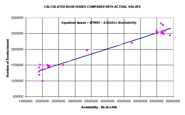 The extremely good correlation between the book issues and book availability parameters suggests that it may be possible to calculate the level of book issues expected from a borough�s public libraries, if the book availability is known. A linear regression was carried out on the data used in this investigation and resulted in the equation: